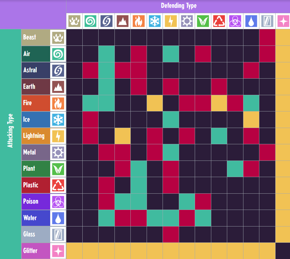 Each monster and move has an elemental type that determines its strengths, weaknesses, and abilities. This guide is the elemental type chart image, so you can print it out. Yellow indicates the attack changes the defender to a different type. It's a pain to keep looking up in the game. In cassette beasts, every monster has one elemental type, and.