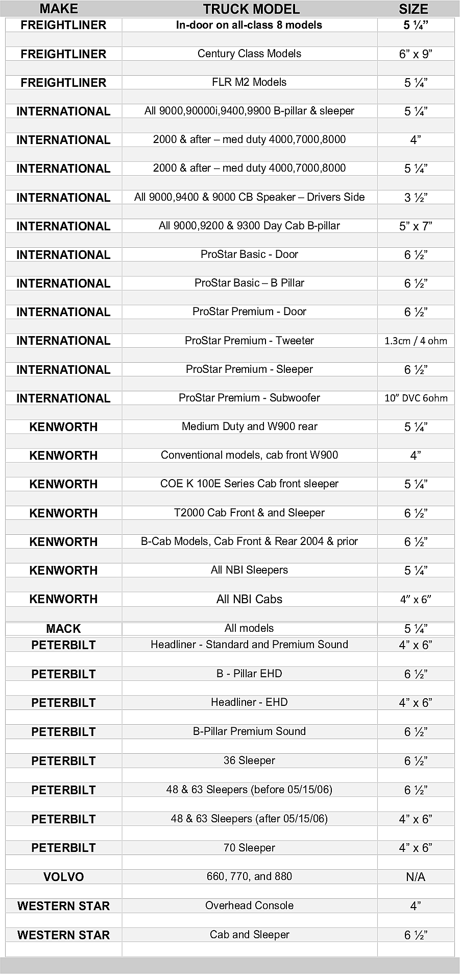 Speaker Size Chart