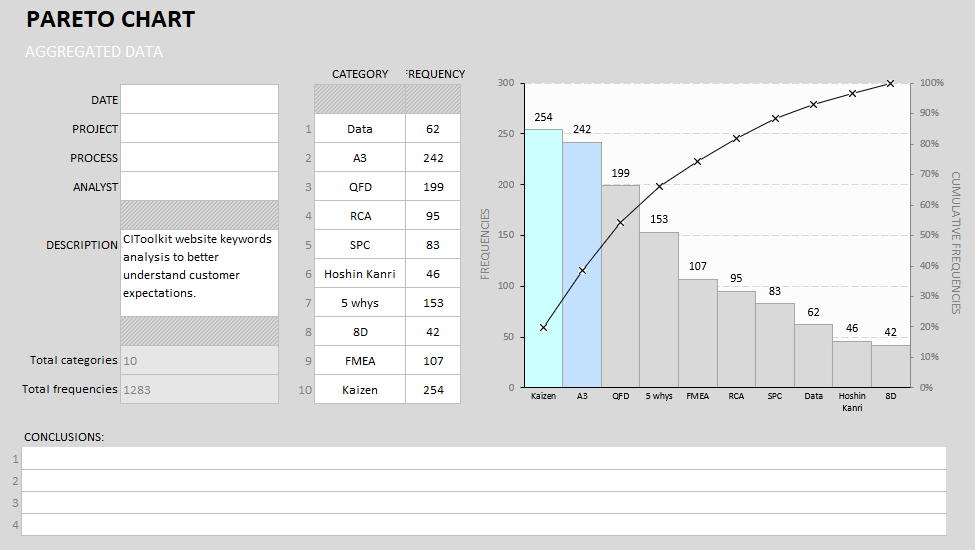 What Is Pareto Chart - A pareto chart is a type of chart that contains both bars and a line graph, where individual values are represented in descending order by bars, and the cumulative total is represented by the line. What is a pareto chart? A pareto analysis is most effective when each variable being tracked is graphically depicted. A pareto chart is a bar graph. A pareto chart is a statistical chart which orders the causes or problem in the descending order of their frequency and their cumulative impact. Histogram chart is used inside the pareto chart.